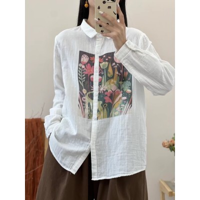 纯亚麻印花衬衫 2024春季新款 翻领长袖复古休闲宽松女士开衫上衣