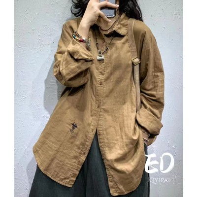 ed6387棉麻大版刺绣衬衣2023新款纯色宽松休闲衬衫百搭上衣女