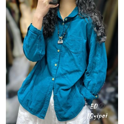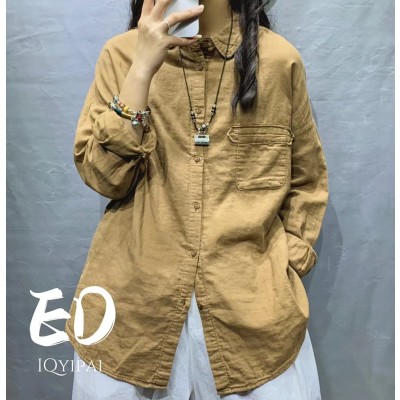 ed8952纯色复古棉麻斜门襟设计衬衫2023新款宽松休闲百搭长袖衬衣
