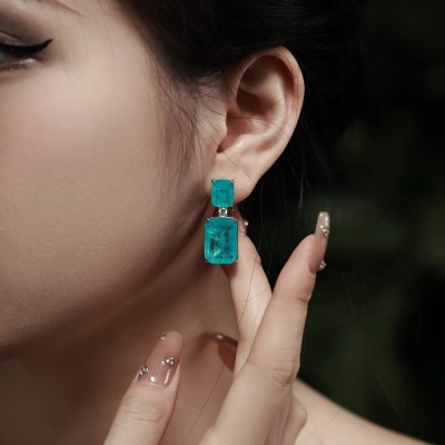 仙璨珠宝 新款帕拉伊巴8*12蓝宝石耳钉女欧美优雅气质S925银耳环