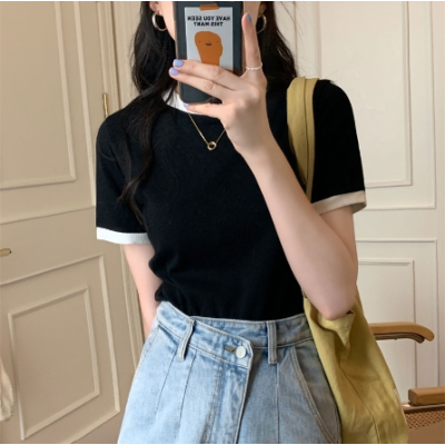撞色圆领短袖t恤女2023年新款夏季打底衫韩版修身短款学生上衣潮