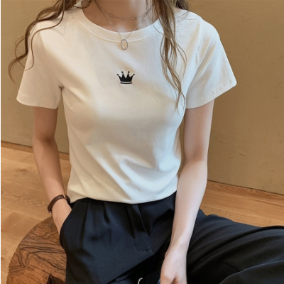 2023夏季新款修身刺绣圆领短袖T恤女装学生女士打底上衣一件代发